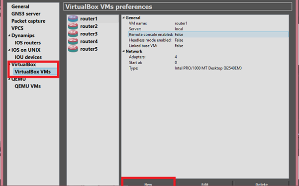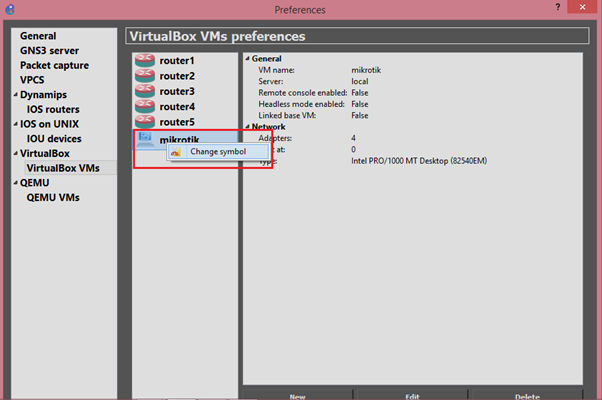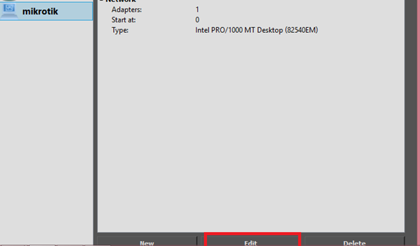 Setelah kita klik finish tadi maka secara otomatis perangkat kita sudah muncul. Namun port ethernet yang dimiliki perangkat kita hanya 1 port saja. Untuk menambahnya klik edit (pada kolom merah di bawah).