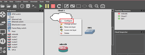 Untuk masuk ke winbox terlebih dahulu kita drag and drop satu persatu perangkat yang di butuhkan. Karena kita masih belajar kita masukkan saja cloud, switch, dan tentunya perangkat kita. Sebelum kita mengkoneksikan perangkatnya kita terlebih dahulu mengatur port pada cloud. Caranya klik kanan pada cloud dan pilih configure