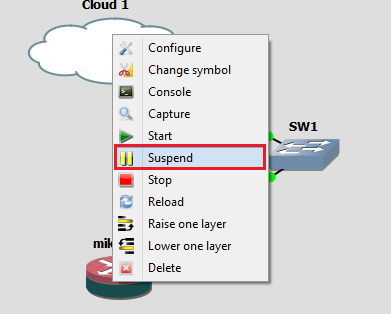Menghubungkannya sudah tinggal kita menjalankan perangkatnya. Caranya klik kanan pada perangkat mikrotik pilih suspend.