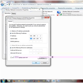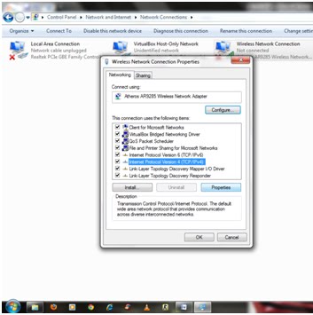 kalau langkah diatas masih belum bisa berarti belum ada kesamaan NETWORK dalam IP addresnya,untuk menyamakanya ikuti langkah berikut open network and sharing center–>change adapter settings –>klik kanan wireles network connection–>properties–>internet protocol TCP/IP 4–>properties