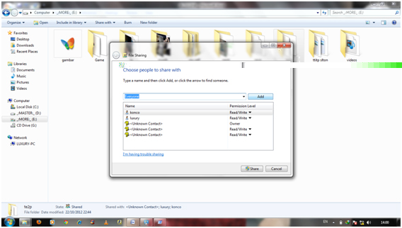 next,Untuk mengeceknya seperti tadi melalui RUN ketikan IP tujuan atau IP laptop teman anda bisa juga nama laptop temen sobat……. klo udah bisa,kita ganti topik tentang berbagi file lewat add hoc Agar bisa saling bertukar data harus ada file atau data yang di sharing. Untuk mensharing data ikuti langkah berikut pilih folder yang akan di share klik kanan–> share with–>specific poeple