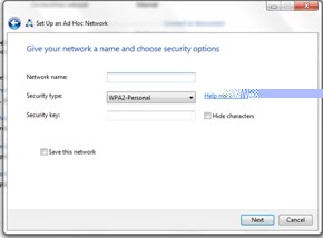 Isi network name (nama jaringan) ad hoc dan security key (jenis keamanan)